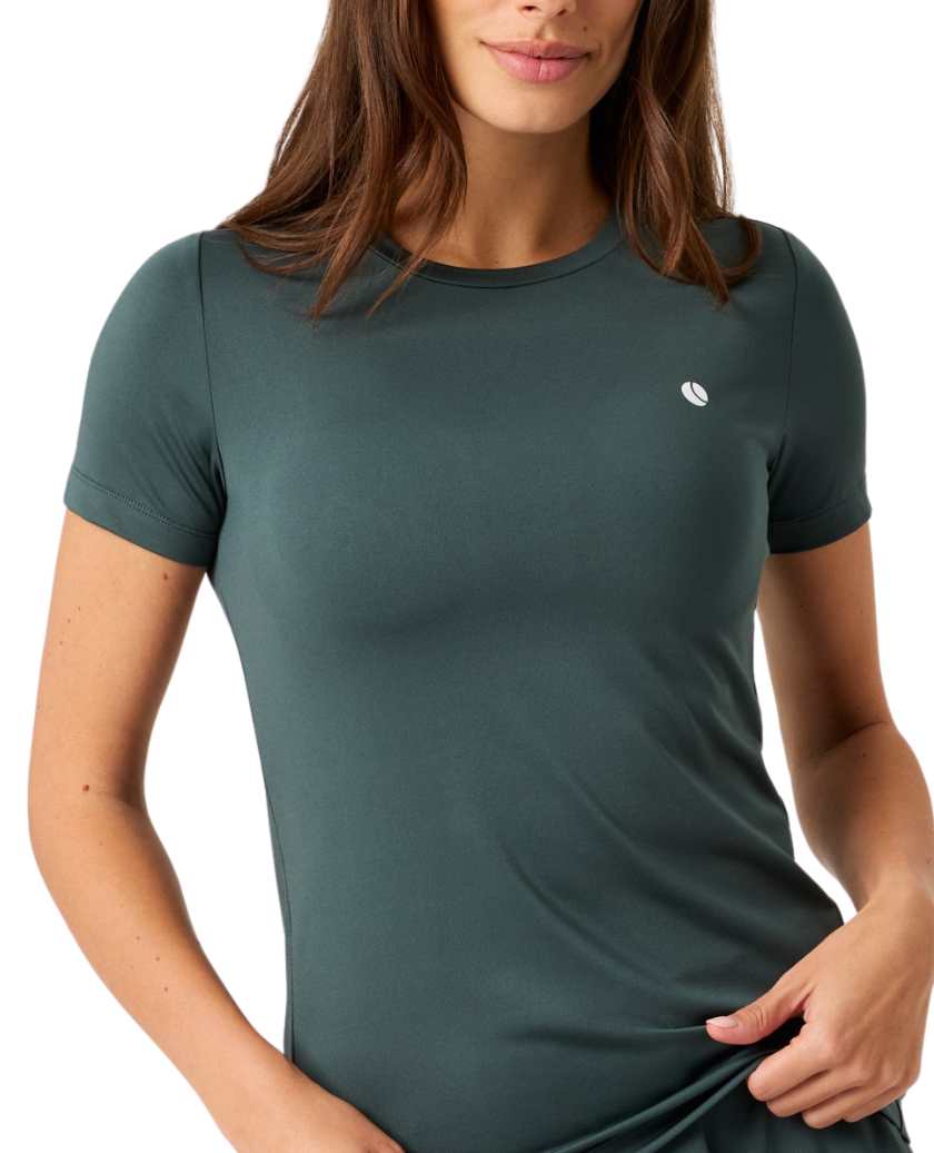 The Björn Borg Ace Slim T-Shirt in green is made from soft recycled polyester stretch quality fabric. It comes in a slim fit with a round neck and short sleeves, and features the tennis logo on the front. Perfect for tennis or casual wear.