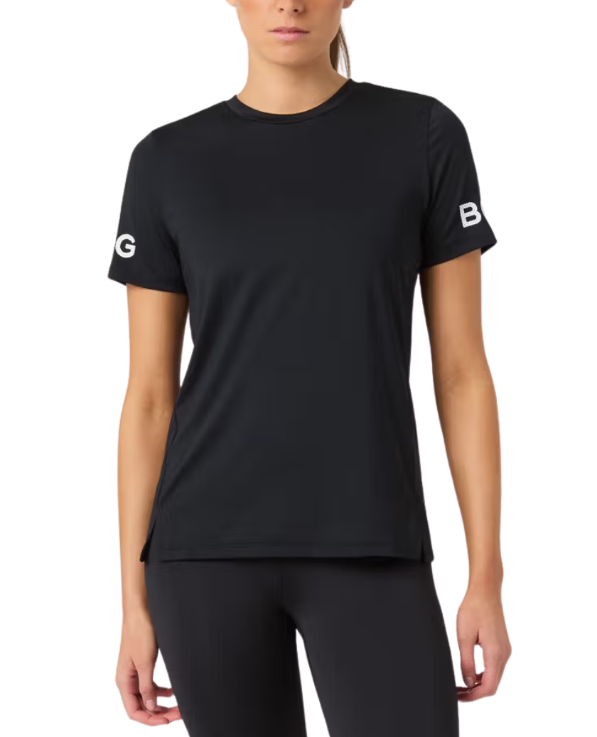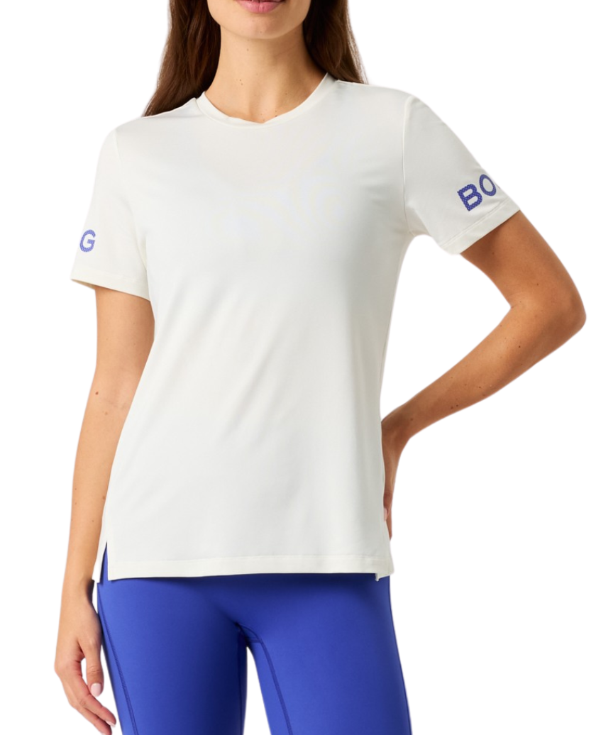The Björn Borg Borg T-shirt for women in white is made from soft recycled polyester stretch quality fabric. It comes in a regular fit and features a round neck, slits on the sides for enhanced movability, and the classic Borg prints on the arms.